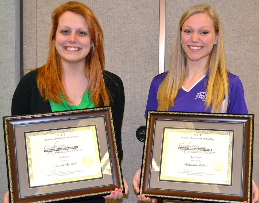 Niagara University has announced that two of its students were presented with awards for presentations they made at the Conference for Undergraduate Research in Communication, held April 18 at RIT.