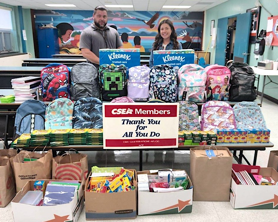 CSEA Unit 7650 recently hosted a back-to-school drive to collect and distribute free school supplies to families in need. During the months of July and August, union members collected items including backpacks, tissue, pencil pouches, crayons, colored pencils, pens, pencils, folders, paper, notebooks and binders for Tuscarora Nation Elementary School students.