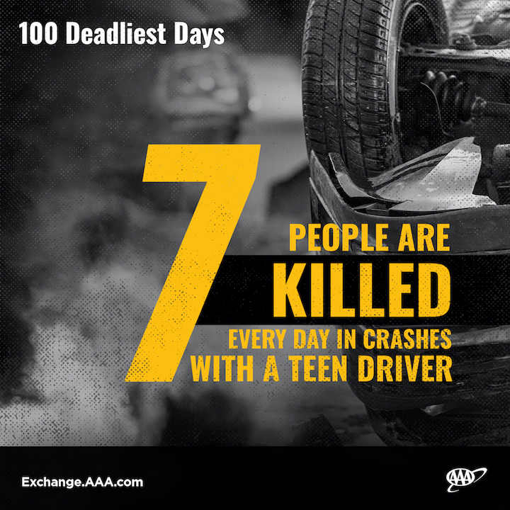 The "100 Deadliest Days" is the period between Memorial Day and Labor Day when fatal teen crashes increase dramatically. Nationwide, 7,124 people died in teen driver-related summertime crashes over a 10-year period from 2011-20. That's more than seven people a day each summer, and that is nearly half of the total number of those killed in teen-driver crashes for the entire rest of the year.