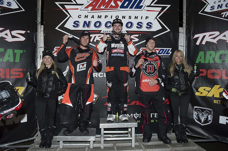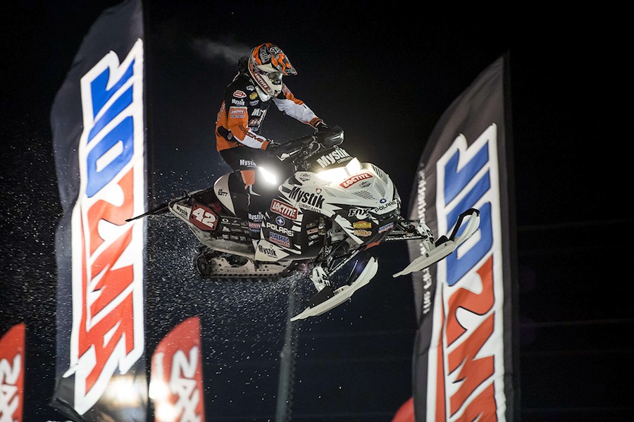 With thousands of fans pouring out of the packed grandstands and lining the hill adjacent to the AMSOIL Championship Snocross track at Seneca Allegany Casino, the stage was set for a couple powerful Pro class main events at the inaugural running of the Seneca Allegany Air Force Snocross.