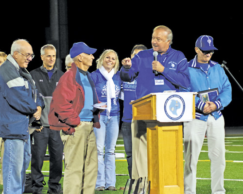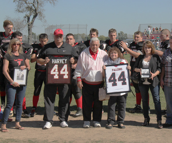 The Niagara Wheatfield Football Families Association presented the family of former Falcon Terry Harvey and Niagara-Wheatfield High School with framed jerseys Saturday, Sept. 27, during the rededication of the school's football field.