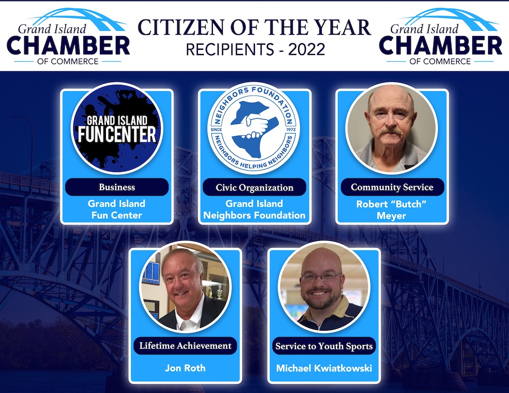The Grand Island Chamber of Commerce will honor the following at the 55th annual Grand Island Citizen of the Year Awards Dinner, set for 6-9 p.m. Thursday, Oct. 13, at the DoubleTree by Hilton Hotel Niagara Falls, 401 Buffalo Ave. Organizers said, "The Chamber's Citizen of the Year Awards are presented annually to businesses and individuals whose contributions have truly made Grand Island a better place to live, work and play. We're excited to announce this year's recipients below. Please join us in celebrating their hard work, dedication and passion!"