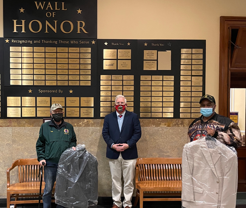 Erie County Clerk Mickey Kearns received a generous donation from Joe Terranova, owner of Tuxedo Junction, who provided more than 300 suits and dress pants to benefit the clerk's "Suits for Troops" season of giving drive.