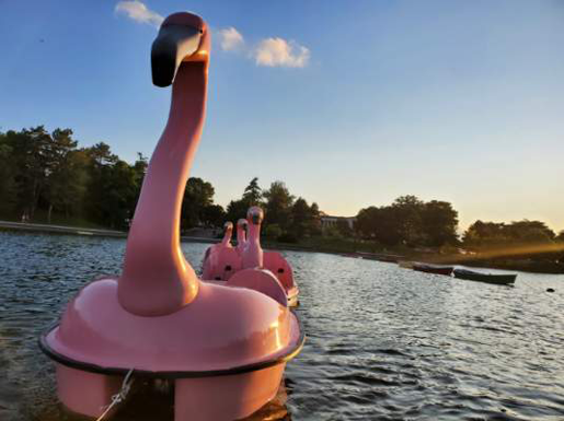The FLOtilla of four FLOATmingos on Hoyt Lake grew with the arrival of three additional bright pink flamingo paddleboats, making it a true Flam-bouyance. Available for rent through Hoyt Lake Rowboats, the FLOATmingos offer summer fun for the whole family in a safe, socially distant environment.