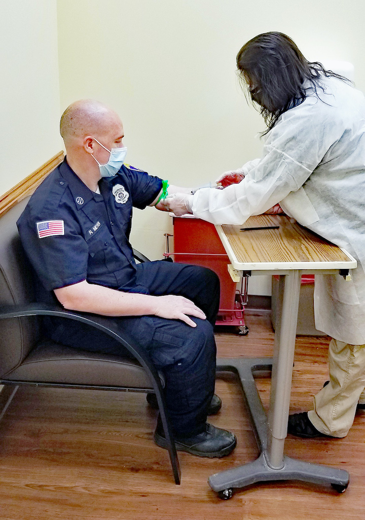 Laboratory Assistant Jane Markarian, right, draws a blood sample for antibody testing from Grand Island Fire Co. EMS Director Robert Meyer at Niagara Falls Memorial Medical Center's Porter Road Patient Service Center in the Town of Niagara.