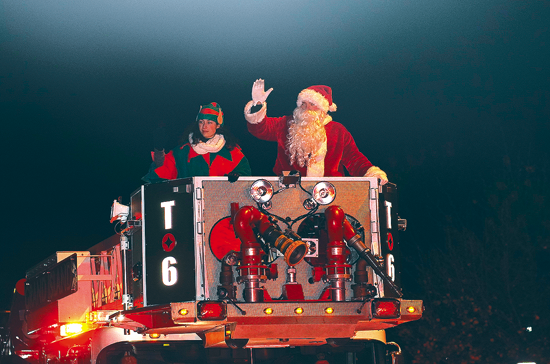 Santa Claus (Noah Teator) and an elf (Megan Stanley) of the Grand Island Fire Co. rode ladder truck No. 6 last Saturday in the Light Up the Boulevard Parade to the Town Commons, where Santa lit the town Christmas tree. (Photo by Larry Austin)