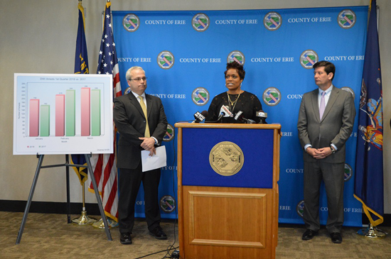Erie County Executive Mark C. Poloncarz and Commissioner of Central Police Services James Jancewicz were joined Thursday by Bronte Williams of Buffalo to spread an anti-DWI message and review DWI numbers from the first quarter of 2018.