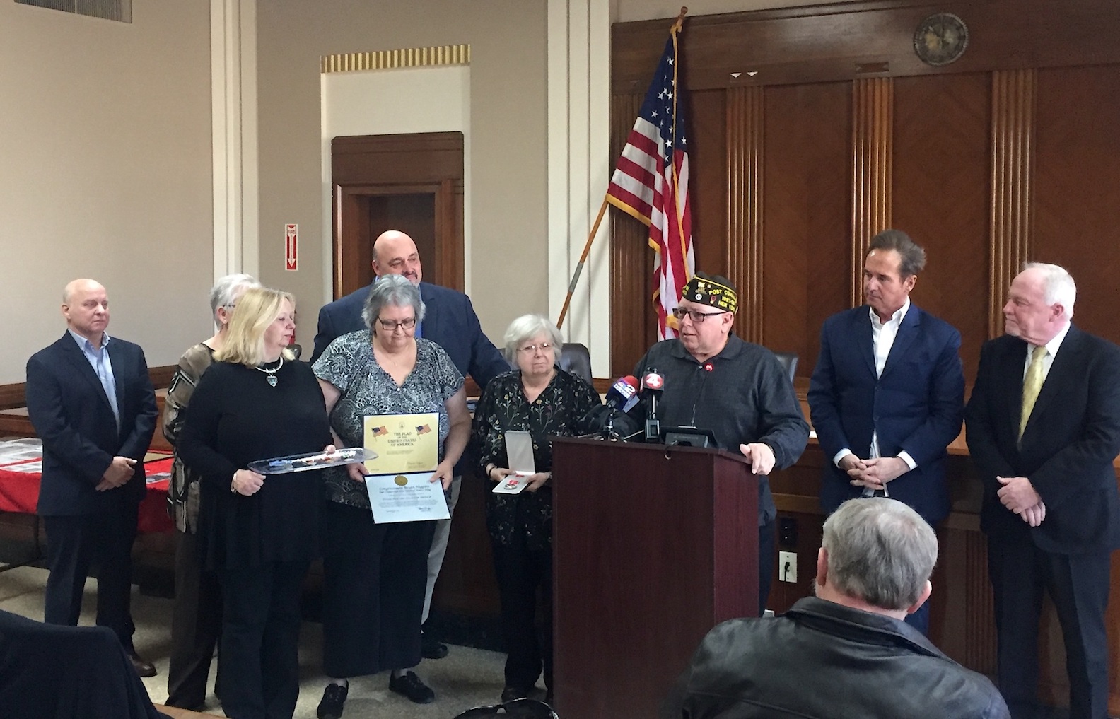 On the eve of International Holocaust Remembrance Day, Congressman Brian Higgins, Town of Tonawanda Deputy Supervisor John Bargnesi, Village of Kenmore Mayor Patrick Mang, Tonawanda Councilman Dan Crangle of and other local leaders paid tribute to Howard Michael Ehrhardt, a World War II veteran from Western New York who helped to liberate Dachau (DAAK-HOW), Hitler's first and longest-run concentration camp in Germany. During a ceremony in Tonawanda Town Hall, Ehrhardt's military service medals were presented to his son, Howard Michael Ehrhardt Jr., also a U.S. Army veteran, who served during the Vietnam War.