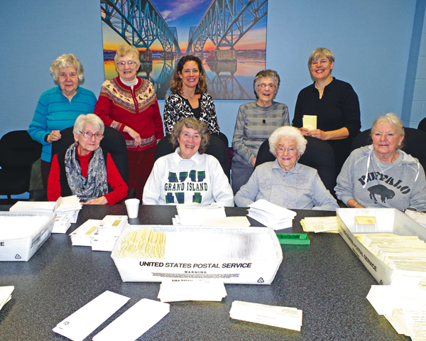 Volunteers from the Grand Island Golden Age Center visited Town Hall to sort tax bills and stuff envelopes, continuing a twice-yearly tradition.