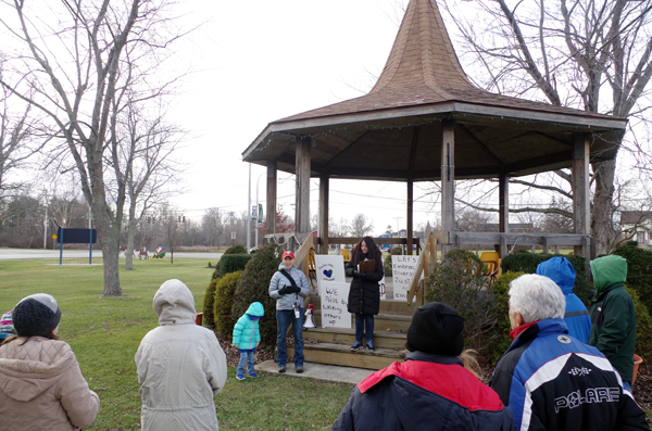 Cold but bracing weather greeted 15 people at the Grand Island Rotary Gazebo in the Town Commons for a brief peace rally Saturday afternoon.