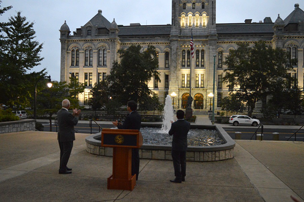 Erie County Executive Mark C. Poloncarz was joined Tuesday by Erie County Legislator Joseph Lorigo (10th district), Commissioner of the Department of Public Works John Loffredo, and residents to officially "turn on the lights" and celebrate renovations at the restored Old Erie County Hall at 92 Franklin St., Buffalo.