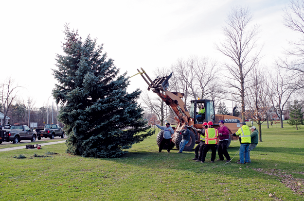 In a symbolic start of the holiday season, Town of Grand Island Highway Department personnel set up a 30-foot blue spruce in the Town Commons Tuesday.