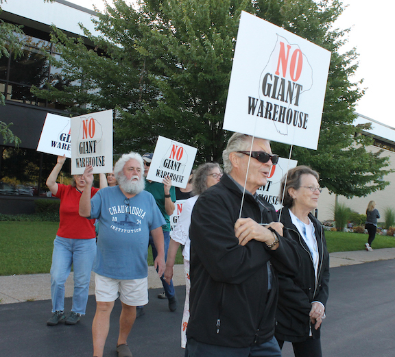 About 40 protesters on Monday marched outside Town Hall in favor of a warehouse moratorium and against the Town Board accepting a developer's supplemental Draft Environmental Impact Statement (DEIS) for a proposed 1.2-million-square-foot Long Road warehouse.