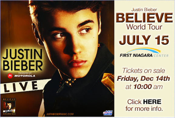 As millions of fans celebrated the success of the "Believe" album and accompanying sold-out "Believe" world tour, global superstar Justin Bieber announced additional 2013 shows on his headlining tour of North America, which includes a stop at First Niagara Center on July 15, 2013.