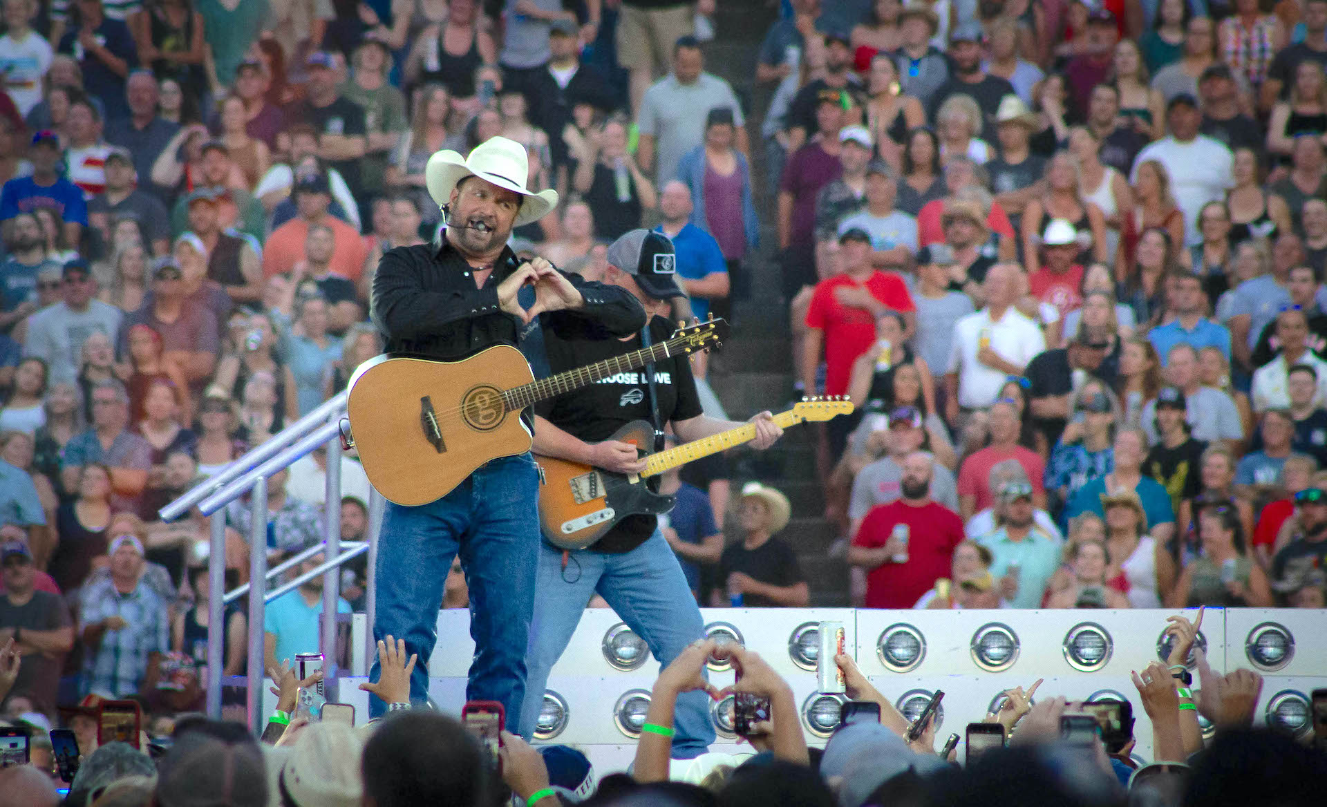 It's 8:20 p.m. on a hot Saturday night in Orchard Park, and at Highmark Stadium, Garth Brooks is getting ready to make his entrance. As the drums rise up, they reveal Brooks underneath them, looking like Hercules lifting them skyward. It's a grand entrance, and the fans respond with a loud roar. It's finally showtime.