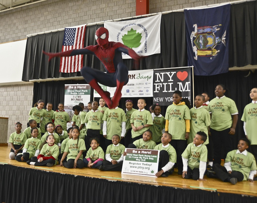 Spider-Man, star of Columbia Pictures' "The Amazing Spider-Man 2," visited Riverbank State Park to encourage youth to "Be a Hero" at their favorite New York state park and register to volunteer Saturday, May 3, for "I Love My Park Day."