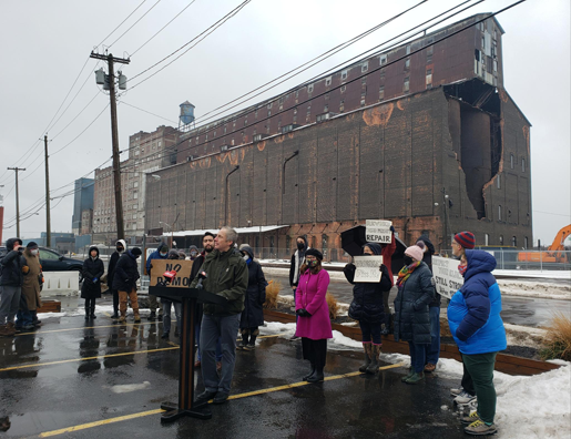 On Sunday, New York State Sen. Sean Ryan and Assembly member Jon Rivera joined representatives from Preservation Buffalo Niagara to call on the City of Buffalo to take action to prevent the demolition of the Great Northern grain elevator on Ganson Street.