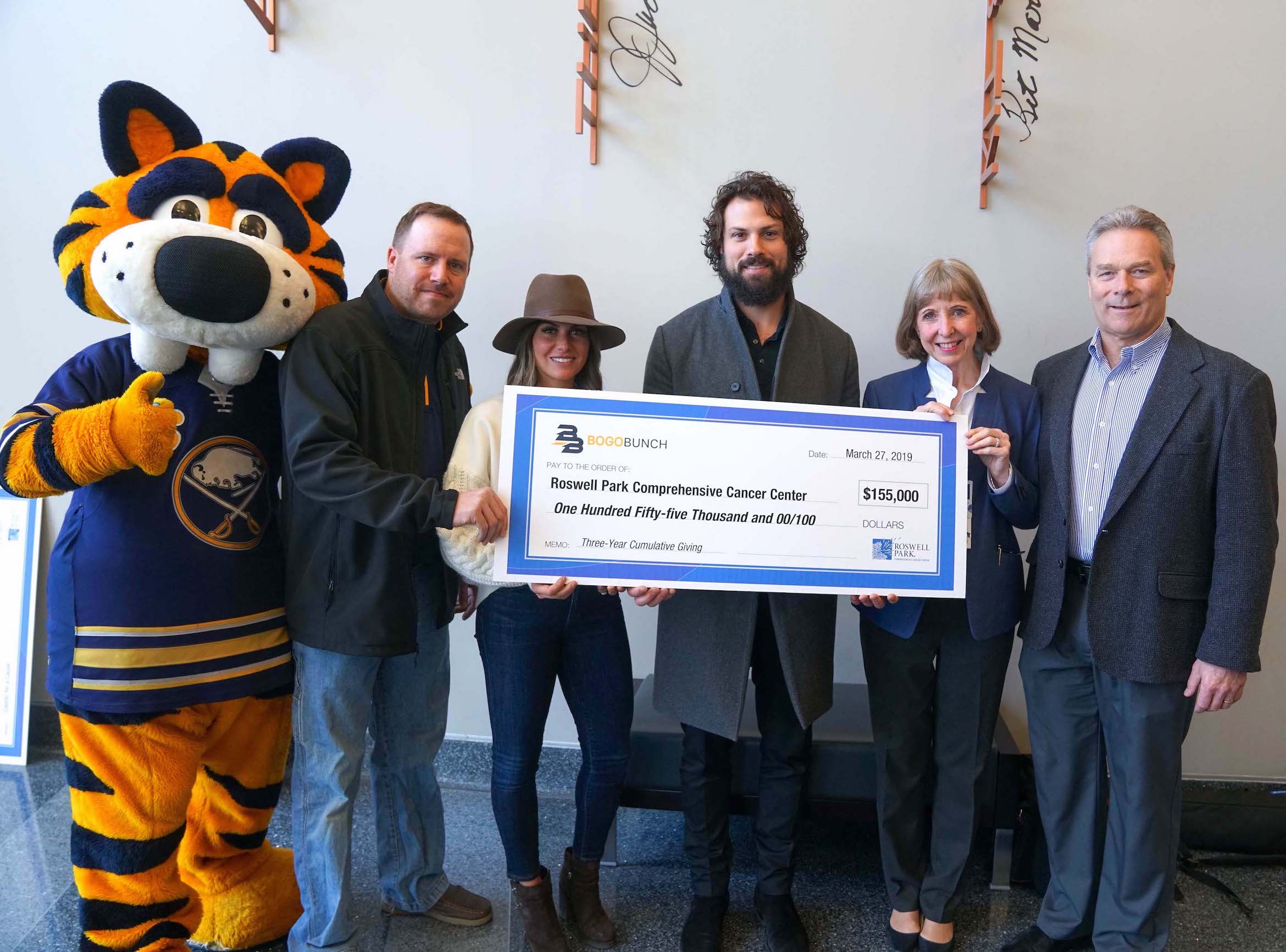 On Wednesday, Buffalo Sabre Zach Bogosian and his wife, Bianca, presented Candace Johnson, Ph.D., Roswell Park President and CEO, as well as RPCI patient Matt Hoffower, with a $75,000 donation to support research and care at the comprehensive cancer center.