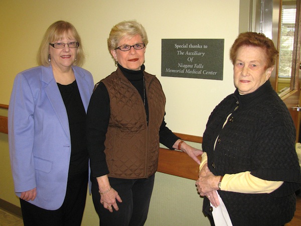 Niagara Falls Memorial Medical Center Auxiliary President Jane Grenke, right, and Vice President for Operations Patricia Berggren, center, presented a $100,000 auxiliary gift to medical center Vice President for Foundation and Community Relations Ann Marie Tucker.