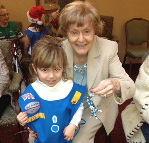 A group of Daisy Girl Scouts from Troop 30011, kindergarteners from Maple East Elementary School in Williamsville, showed just how "Helpful and Friendly" they could be when they taught the residents of Amberleigh Retirement Community how to make snowflake ornaments.