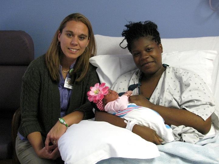 Women's Services Director Susan V. Martin, left, and Mitika Bailey of Niagara Falls get acquainted with Bailey's newborn daughter, Ne'vayeh Katrina Pace, at Niagara Falls Memorial Medical Center.