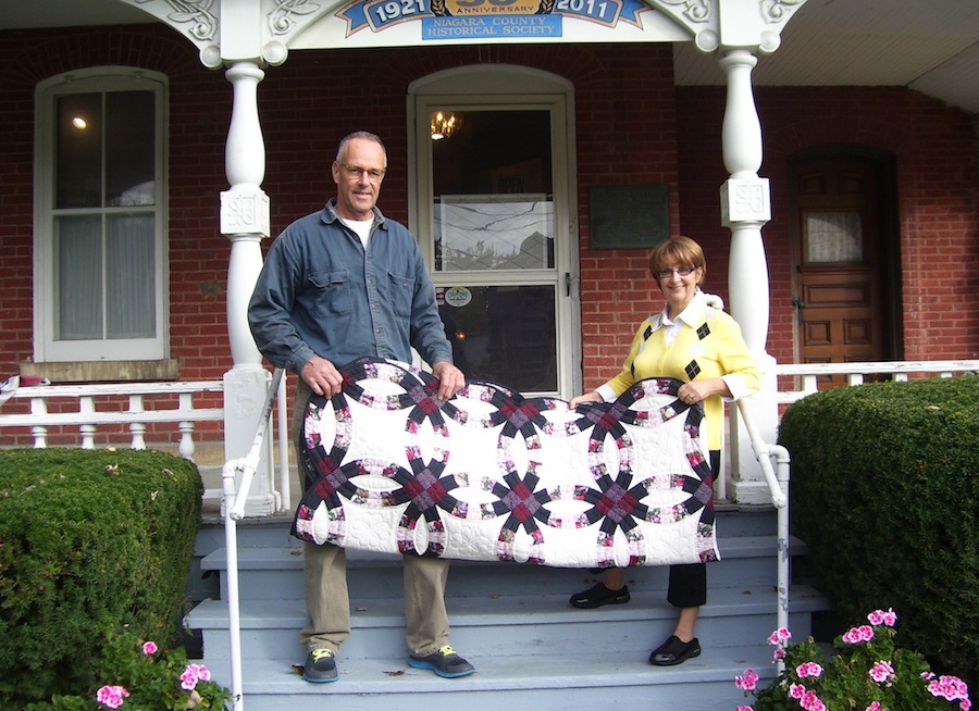 Paul and Paula Mayers of Lockport have won a handmade Amish quilt in the Niagara History Center's 25th annual quilt drawing. This year's quilt was a double-wedding-ring pattern of black and red on a white background.