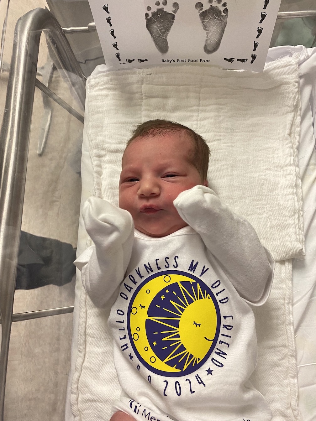 Babies born at Catholic Health's Sisters of Charity Hospital and Mercy Hospital of Buffalo this past weekend and today, including Theodore and Vivian pictured here, are modeling the latest in solar eclipse baby gear, including a onesie that says, "Hello darkness my old friend."