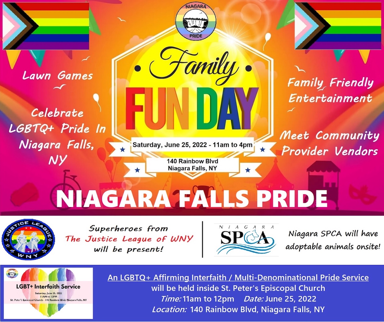 Niagara Pride is hosting "Niagara Falls Pride: A Family Fun Day" on Saturday, June 25. The event will be held from 11 a.m. to 4 p.m. on the grounds of its offices and St. Peter's Episcopal Church at 140 Rainbow Blvd., Niagara Falls.