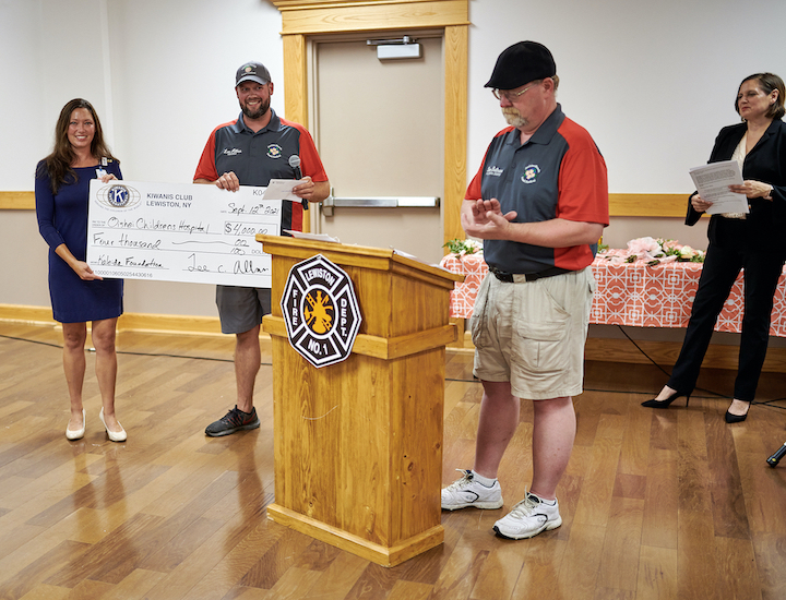 On the closing night of the 63rd annual Niagara County Peach Festival, the Lewiston Kiwanis Club presented a check in the amount of $4,000 to the John R. Oishei Children's Hospital. The organization, on Sunday, also presented a check for $883.80 to Lewiston No. 1 Fire Co. This money will be used to purchase an additional automated external defibrillator for response vehicles.
