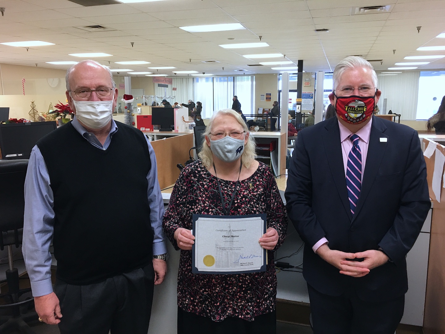Erie County Clerk Michael P. Kearns (right) recognized Cheryl Matter (center) on her retirement from the Erie County Clerk's Auto Bureau Division after more than four decades of dedicated service with the department. Also, on hand for the presentation was Scott Bieler (left), President and CEO of West Herr Auto Group.