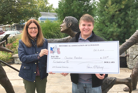 Historical Association of Lewiston Vice President Leandra Collesano presented a $500 scholarship to Christian Burnham of the Tuscarora Nation on Indigenous Peoples' Day. The pictured ceremony took place at the Tuscarora Heroes Monument in Lewiston.