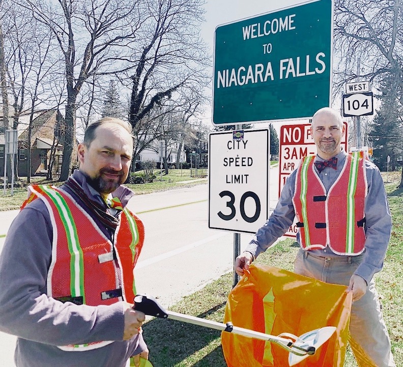 Vagabond Bowties founders Michael Beam and Duke Adams (pictured, from left) are participating in the Adopt-a-Highway program. The two "style miesters" took on a portion of Route 104, just past Niagara University on the way to DeVeaux. They will maintain this portion of state-owned Lewiston roadway.
