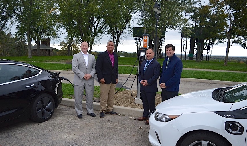 Erie County Executive Mark Poloncarz was joined Tuesday by Erie County Department of Public Works Commissioner William Geary, Coordinator of Clean Communities of WNY Craig Jackson and Tony Hazzan of NYSERDA to cut the ribbon and officially announce the installation of a new dual-port electric vehicle charging station at Chestnut Ridge Park.