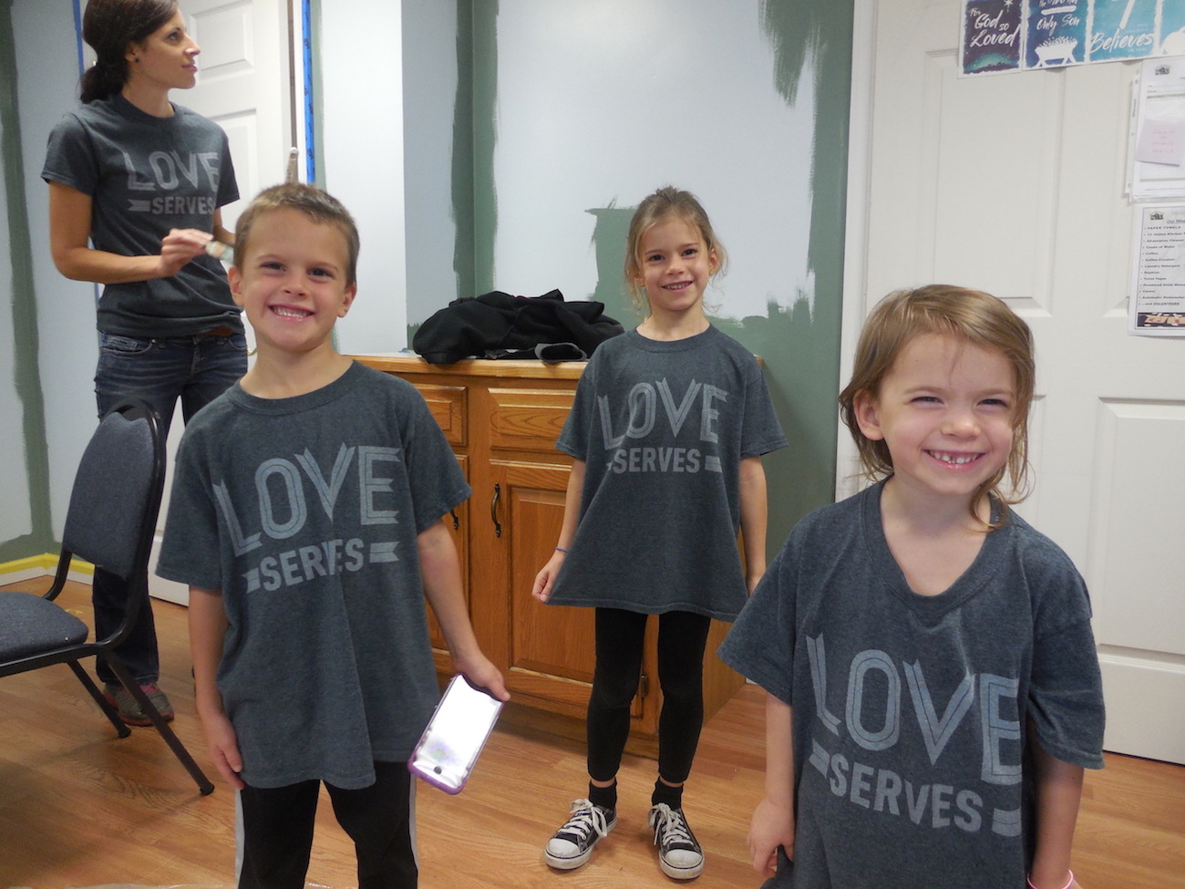 As mom Bridget watches, William (age 5), Fiona (7), and Emma (3) Campbell are seen painting the office during the chapel's "Love Serves" community partnership event at the Lockport CARES campus on Saturday.