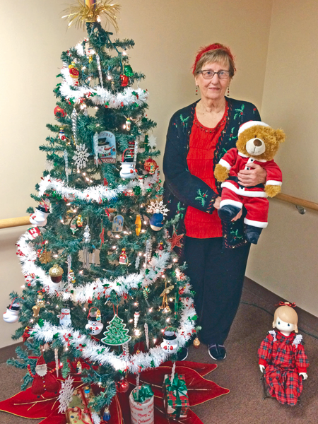 Carol Miranda poses for a photo by the tree she decorated at People Inc. Willow Senior Living.