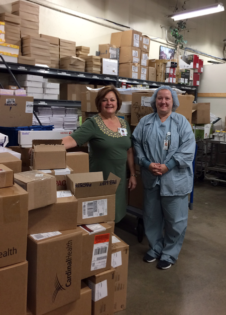 Thanks to the initiative of cardiologist Dr. Zina Hajduczok, of Lewiston Cardiology (pictured at left with perioperative business/systems supervisor Becky Shively), and the cooperation of central services and surgery, Mount St. Mary's Hospital has put together a shipment of medical supplies bound for the Ukraine.