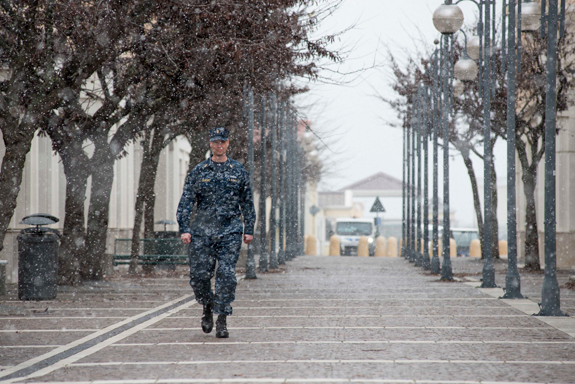 Senior Chief Mass Communication Specialist Daniel Sanford, originally from Buffalo, strides through a snowstorm Monday at Naval Support Activity, Naples, Italy.