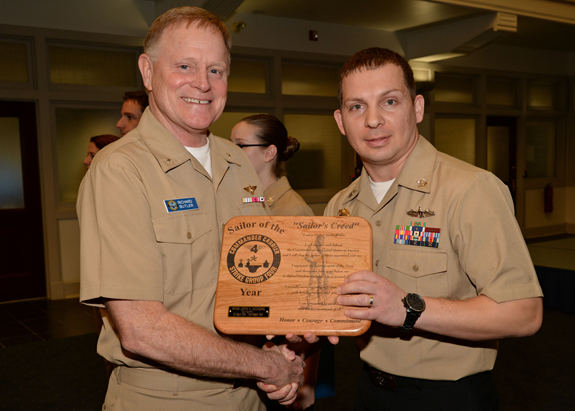 Master-at-Arms 1st Class Joseph Zaccagnino, right, poses with Rear Adm. Richard Butler, commander of Carrier Strike Group (CSG) 4 after being named CSG-4 Sailor of the Year for 2014.
