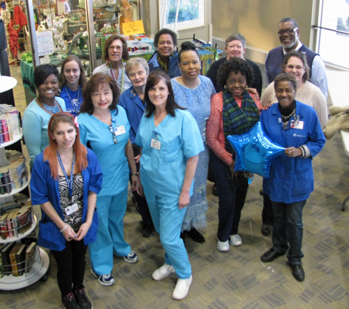 Staff members and volunteers at Niagara Falls Memorial Medical Center dressed in blue Friday to support "Go Blue," a state and national effort to raise awareness about colorectal cancer.