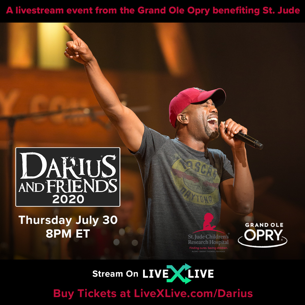 Three-time Grammy Award winner Darius Rucker will be joined by Clint Black and Tracy Lawrence on the iconic Grand Ole Opry stage for a virtual edition of his "Darius & Friends" concert powered by LiveXLive on Thursday, July 30 (8 p.m. ET), benefiting St. Jude Children's Research Hospital.