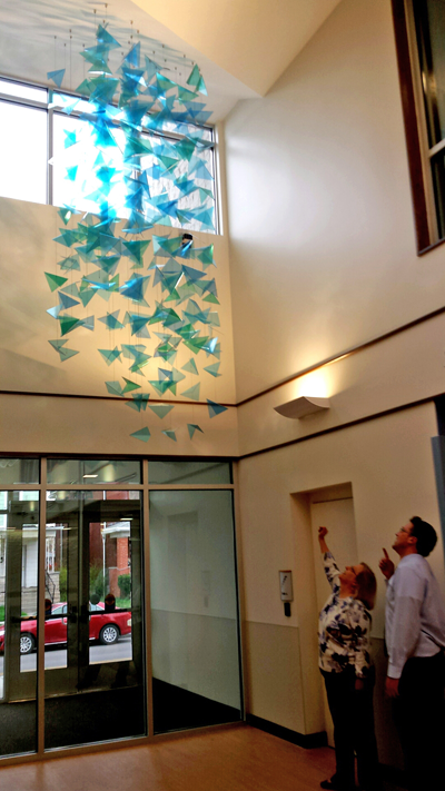The entryway of the new Golisano Center for Community Health at Niagara Falls Memorial Medical Center took on some colorful charm this week with the installation of a mobile created by kinetic sculptors Matt Richards and Ben Cogdill of Ekko Custom Mobiles in Portland, Oregon.