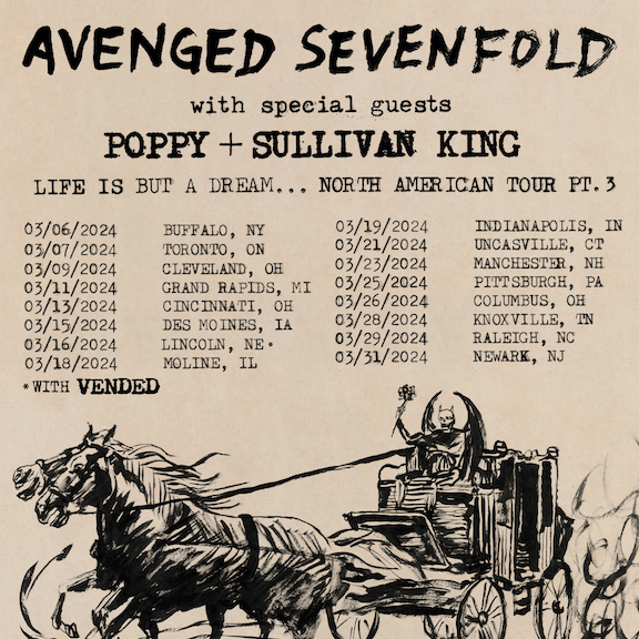 Avenged Sevenfold has announced the third leg of their "Life is But A Dream..." North American tour, featuring Poppy and Sullivan King. The tour includes a stop at KeyBank Center in Buffalo on Wednesday, March 6, 2024.