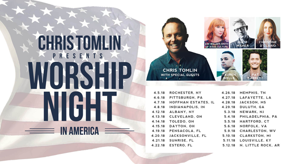 Grammy Award-winner Chris Tomlin continues to work to bring the church together in unity and prayer with his "Worship Night In America" (WNIA) tour. It kicks off again April 5, 2018. Special guests include Kim Walker Smith of Jesus Culture, Matt Maher, Christine D'Clario, Tauren Wells, and Pat Barrett. The tour will hit 24 markets across the U.S., including Rochester, Chicago, Indianapolis, Atlanta and Philadelphia.