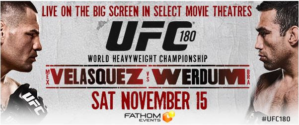The UFC returns to movie theaters nationwide at 10 p.m. ET Saturday, Nov. 15, as Fathom Events and the UFC bring UFC 180: Velasquez vs. Werdum, the UFC's first-ever event in Mexico, to the big screen.