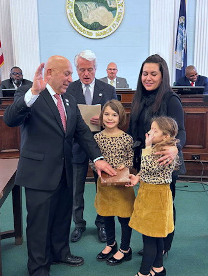 Assemblyman Angelo Morinello, R-C-I-Niagara, was joined by his daughter and granddaughters as he was sworn in Monday by Niagara Falls Mayor Robert Restaino to serve his fourth term in the Assembly.