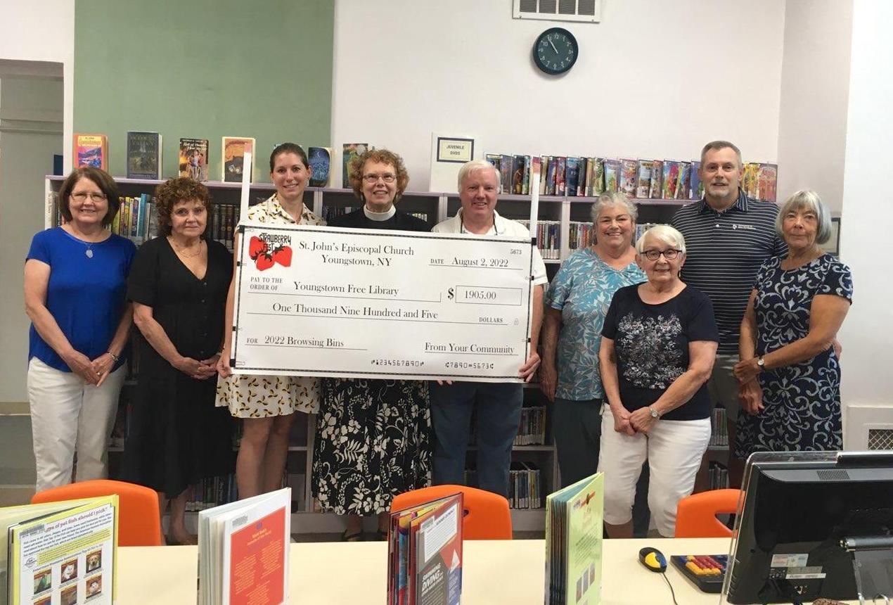 The Youngstown Free Library was presented a $1,905 check on Tuesday for its 2022 "Browsing Bins." This project was the recipient of the free will donation held at the June 25 Strawberry Festival on the grounds of St. John's Episcopal Church in Youngstown.