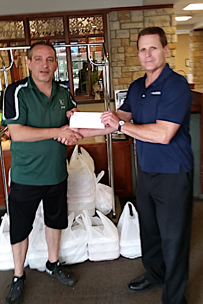 Modern Corporation and Lewiston Porter Youth Football joined forces recently to give back to the community. In the photo, Robert Trunzo of Modern Corporation presents Lewiston Porter Youth Football President Mark Nicoletti with a donation to put toward the purchase of equipment to protect the children.