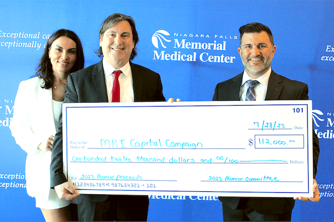 Premier Gala 2023 co-chairs Dr. Peter and Sheryl Muscarella present a check for $112,000 to Dr. Travis Mastroianni from Southtowns Radiology. The funds were raised by the sponsors and 600-plus attendees at Memorial's signature event, which was held at the Seneca Niagara Resort & Casino on April 29.