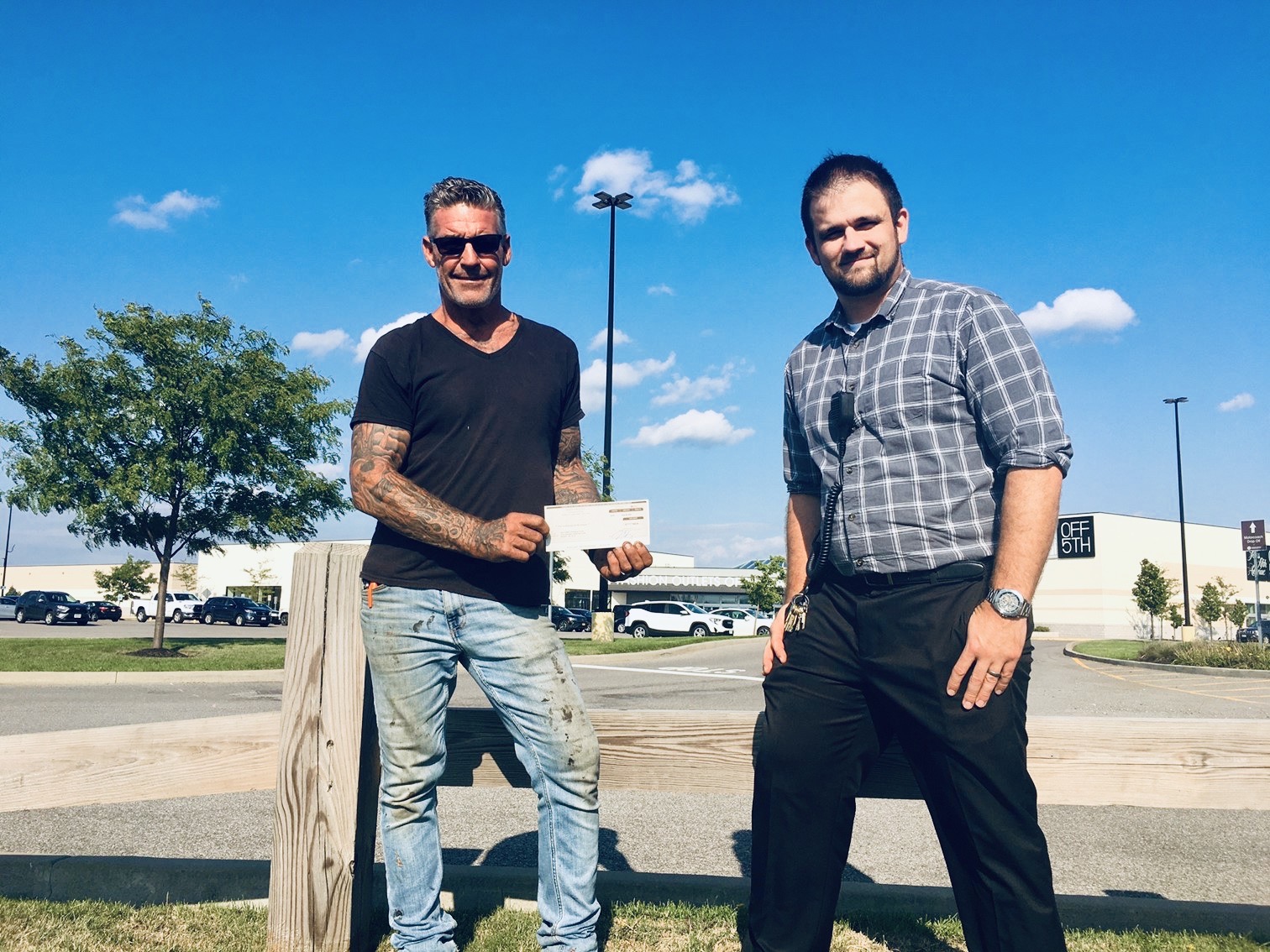 Bill Blake, left, of Wild Kritters/Feathers of Love receives a $500 "Give Fashionably" grant check from Chad Masters, head of security at the Fashion Outlets of Niagara Falls USA. The grant was made possible by both the Fashion Outlets and the Town of Niagara.