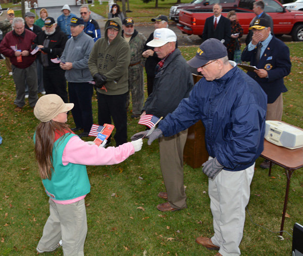 Brownie Scouts from Troop 7008 present flags and lapel pins to veterans at last year's ceremony.